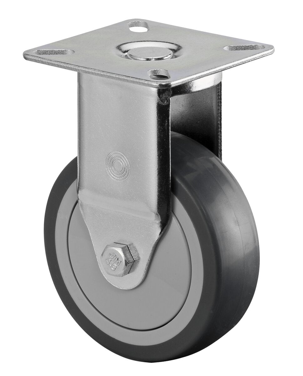 Apparathjul A310.A85.075, Produkttype: Faste hjul, Festing: Platefeste, Ø skruehull: 6.3 mm, Hjulets senter: Plast, Slitebane: termoplastisk gummi grå, Lager: Kulelager, Ø hjul: 75 mm, Lastkapasitet: 75 kg