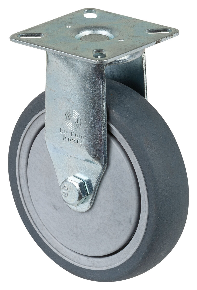 Apparathjul A310.A89.100, Produkttype: Faste hjul, Festing: Platefeste, Ø skruehull: 6.3 mm, Hjulets senter: Plast, Slitebane: termoplastisk gummi grå, elektrisk ledende, Lager: Kulelager, Ø hjul: 100 mm, Lastkapasitet: 70 kg
