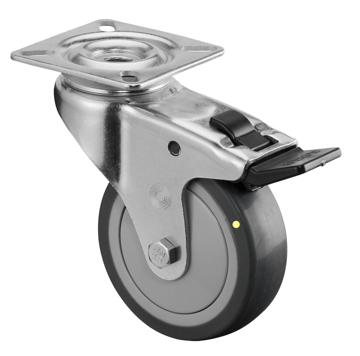 Apparathjul A320.A89.075, Produkttype: Svingbare hjul med bremser, Festing: Platefeste, Ø skruehull: 6.3 mm, Hjulets senter: Plast, Slitebane: termoplastisk gummi grå, elektrisk ledende, Lager: Kulelager, Ø hjul: 75 mm, Lastkapasitet: 60 kg