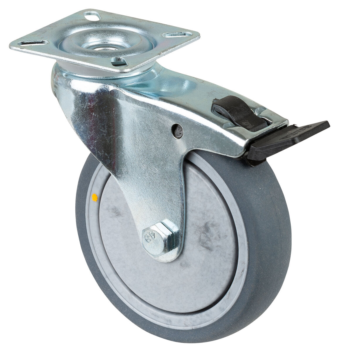 Apparathjul A320.A89.100, Produkttype: Svingbare hjul med bremser, Festing: Platefeste, Ø skruehull: 6.3 mm, Hjulets senter: Plast, Slitebane: termoplastisk gummi grå, elektrisk ledende, Lager: Kulelager, Ø hjul: 100 mm, Lastkapasitet: 70 kg