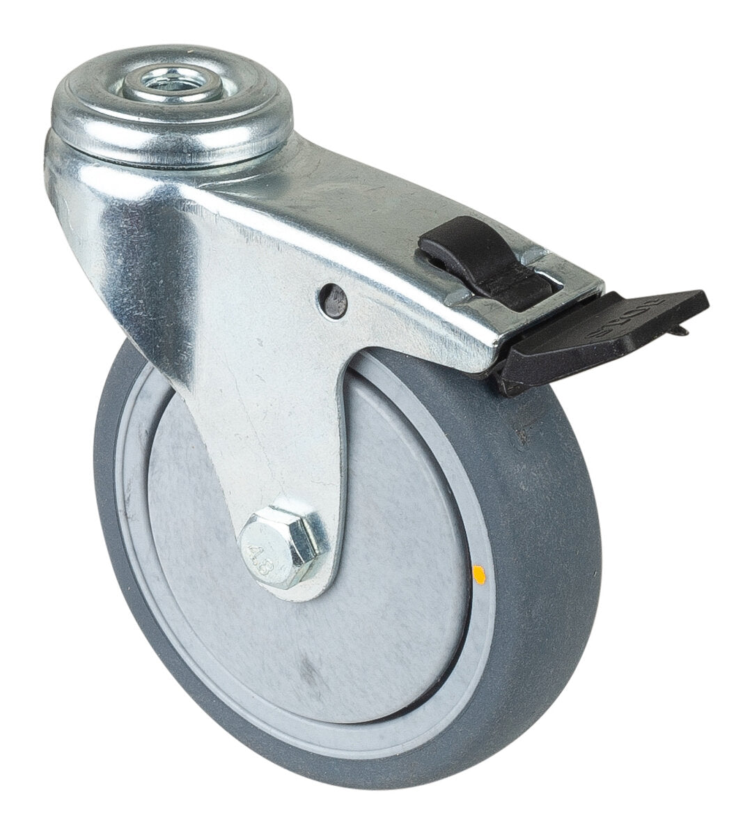 Apparathjul A321.A89.100, Produkttype: Svingbare hjul med bremser, Festing: Senterhull, Hjulets senter: Plast, Slitebane: termoplastisk gummi grå, elektrisk ledende, Lager: Kulelager, Ø hjul: 100 mm, Lastkapasitet: 70 kg