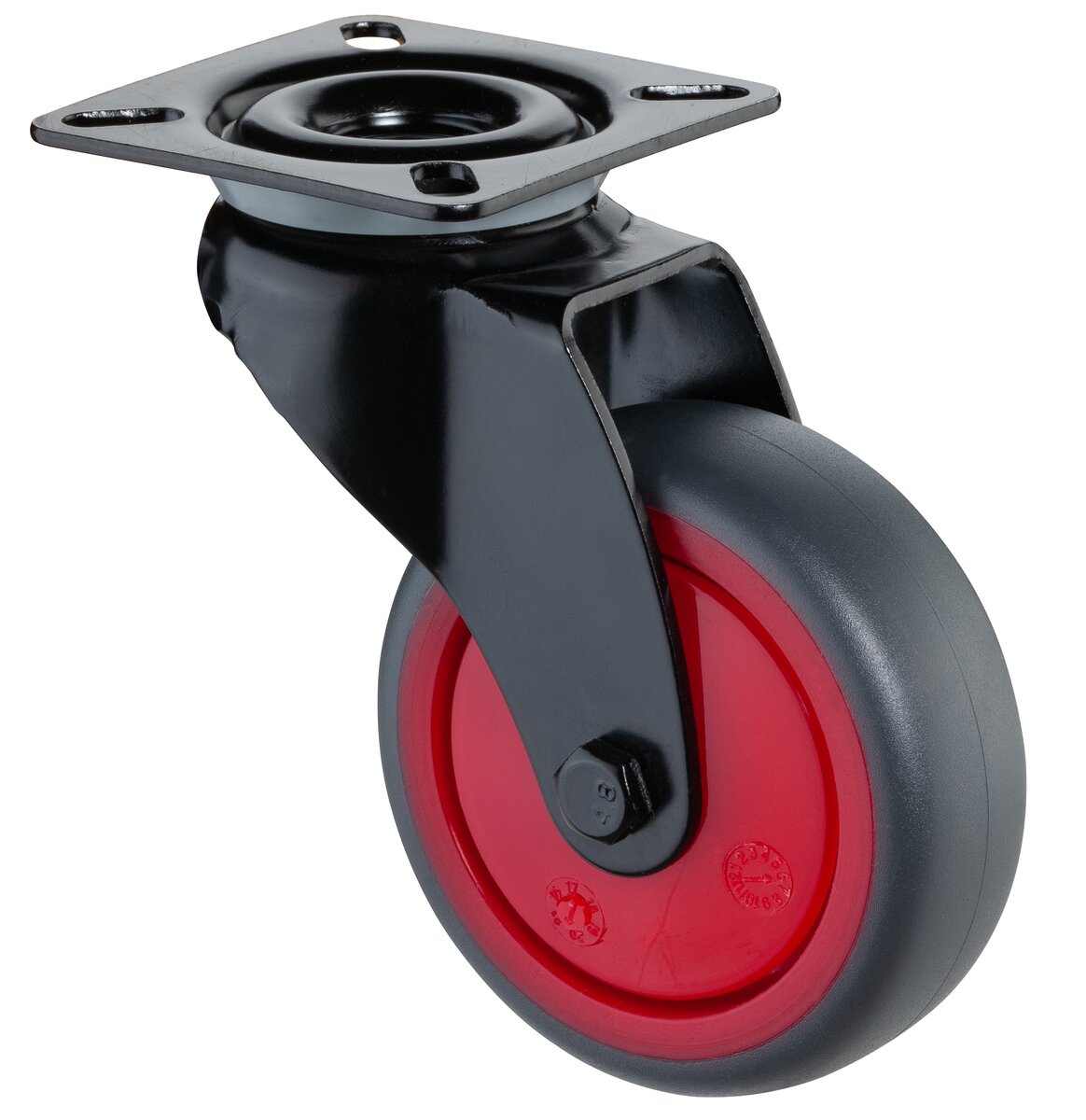 Apparathjul A800.A85.075.03, Produkttype: Svingbare hjul, Festing: Platefeste, Ø skruehull: 6.3 mm, Hjulets senter: Rød plast, Slitebane: termoplastisk gummi grå, Lager: Kulelager, Ø hjul: 75 mm, Lastkapasitet: 75 kg