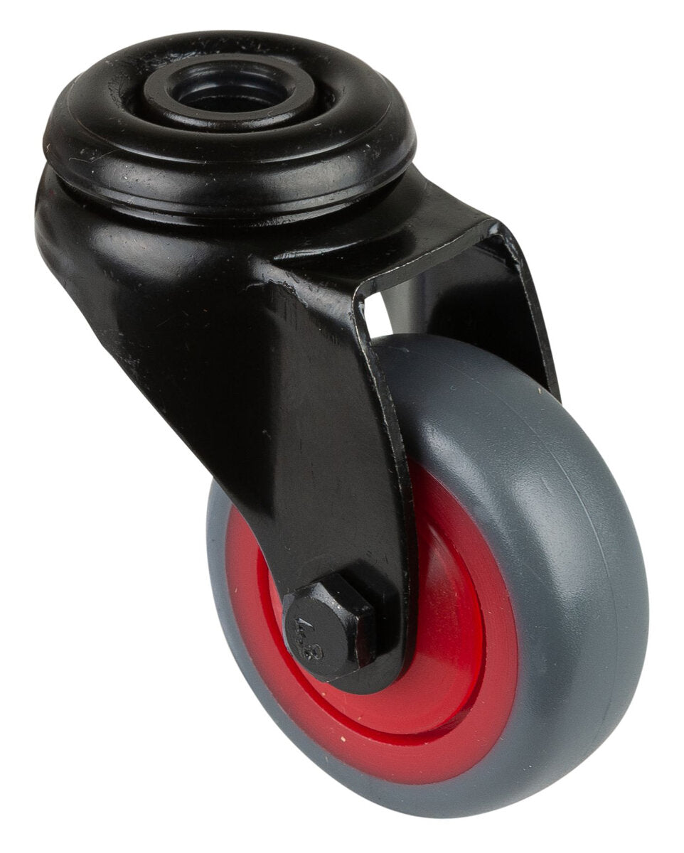 Apparathjul A801.A85.050.03, Produkttype: Svingbare hjul, Festing: Senterhull, Hjulets senter: Rød plast, Slitebane: termoplastisk gummi grå, Lager: Kulelager, Ø hjul: 50 mm, Lastkapasitet: 50 kg