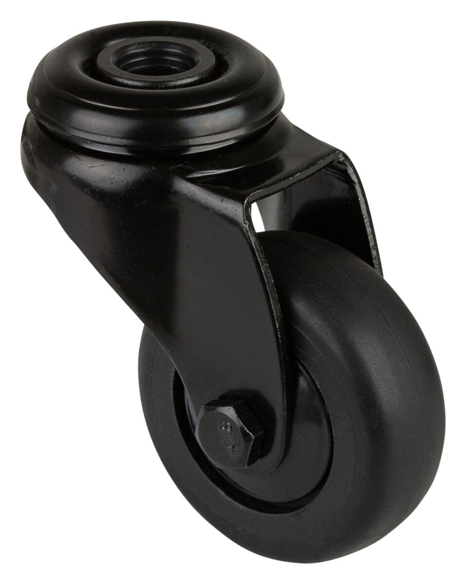 Apparathjul A801.A85.050.06, Produkttype: Svingbare hjul, Festing: Senterhull, Hjulets senter: Svart plast, Slitebane: termoplastisk gummi svart, Lager: Kulelager, Ø hjul: 50 mm, Lastkapasitet: 50 kg