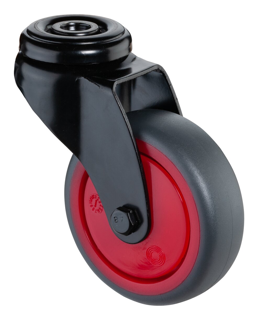 Apparathjul A801.A85.075.03, Produkttype: Svingbare hjul, Festing: Senterhull, Hjulets senter: Rød plast, Slitebane: termoplastisk gummi grå, Lager: Kulelager, Ø hjul: 75 mm, Lastkapasitet: 75 kg