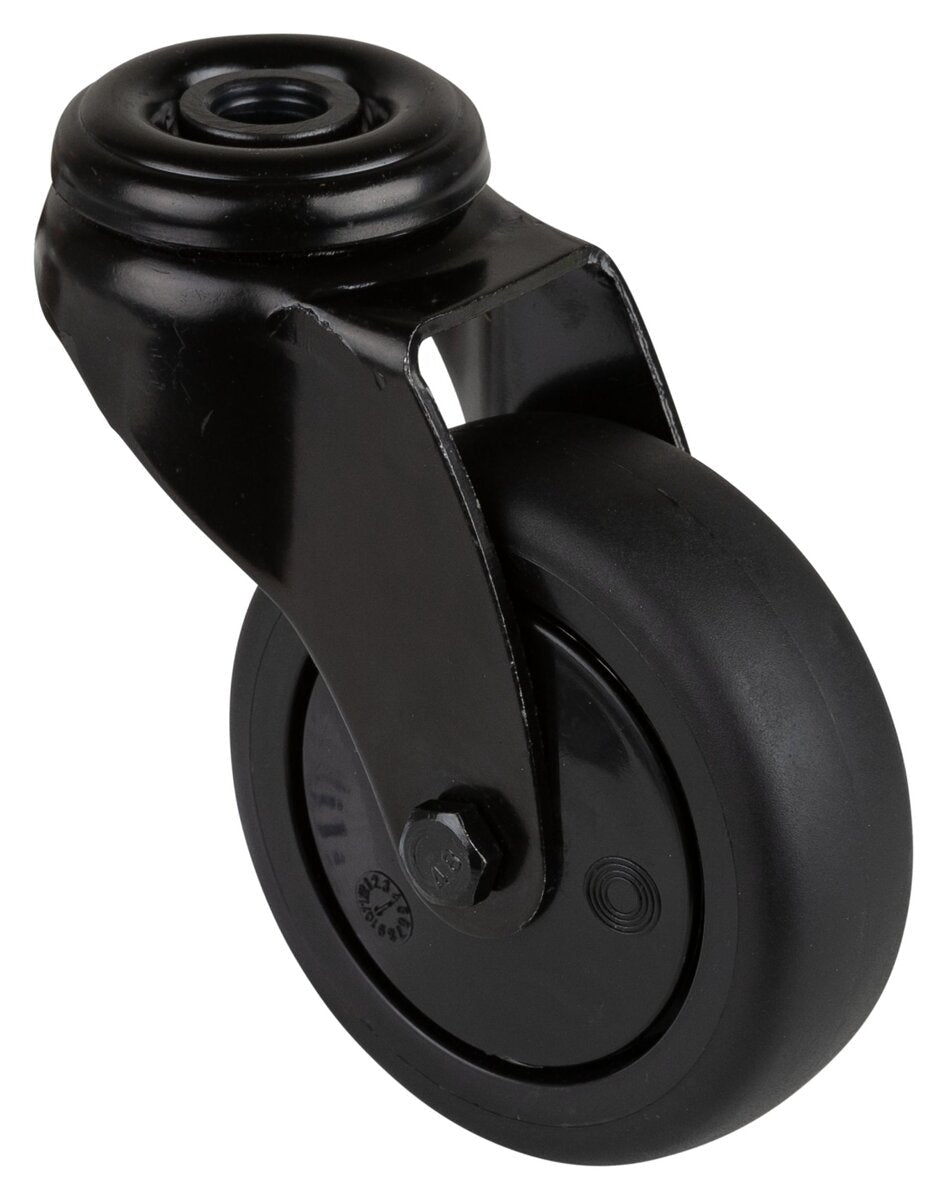 Apparathjul A801.A85.075.06, Produkttype: Svingbare hjul, Festing: Senterhull, Hjulets senter: Svart plast, Slitebane: termoplastisk gummi svart, Lager: Kulelager, Ø hjul: 75 mm, Lastkapasitet: 75 kg