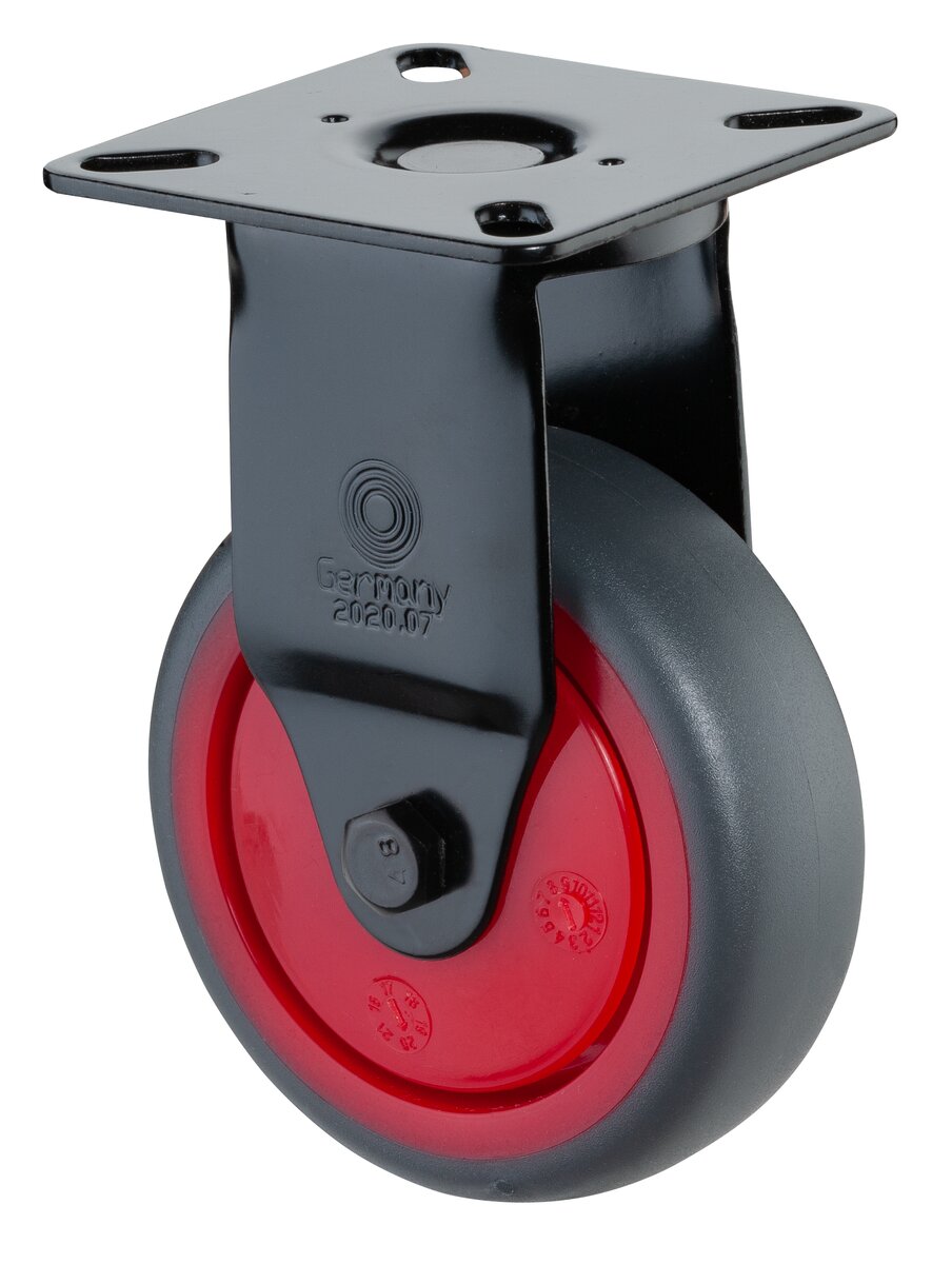 Apparathjul A810.A85.075.03, Produkttype: Faste hjul, Festing: Platefeste, Ø skruehull: 6.3 mm, Hjulets senter: Rød plast, Slitebane: termoplastisk gummi grå, Lager: Kulelager, Ø hjul: 75 mm, Lastkapasitet: 75 kg