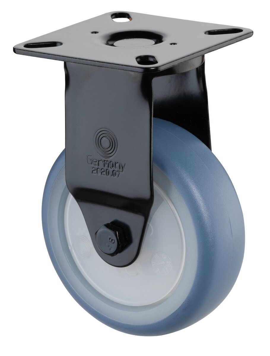 Apparathjul A810.A85.075.05, Produkttype: Faste hjul, Festing: Platefeste, Ø skruehull: 6.3 mm, Hjulets senter: Naturfarget plast, Slitebane: termoplastisk gummi lyseblå, Lager: Kulelager, Ø hjul: 75 mm, Lastkapasitet: 75 kg