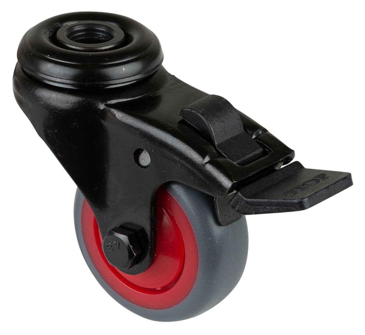 Apparathjul A821.A85.050.03, Produkttype: Svingbare hjul med totalbrems, Festing: Senterhull, Hjulets senter: Rød plast, Slitebane: termoplastisk gummi grå, Lager: Kulelager, Ø hjul: 50 mm, Lastkapasitet: 50 kg