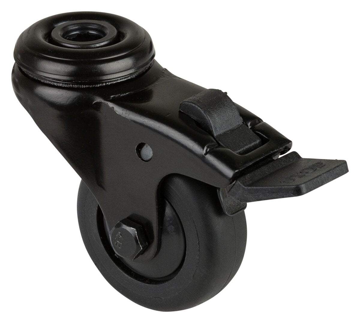 Apparathjul A821.A85.050.06, Produkttype: Svingbare hjul med totalbrems, Festing: Senterhull, Hjulets senter: Svart plast, Slitebane: termoplastisk gummi svart, Lager: Kulelager, Ø hjul: 50 mm, Lastkapasitet: 50 kg