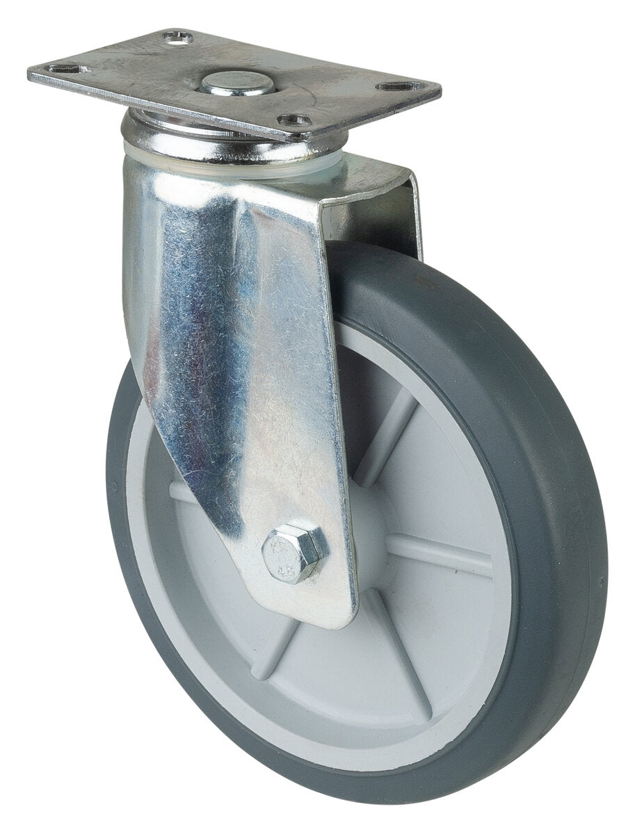 Apparathjul C100.A80.151, Produkttype: Svingbare hjul, Festing: Platefeste, Ø skruehull: 8.4 mm, Hjulets senter: Plast, Slitebane: termoplastisk gummi grå, Lager: Glidelager, Ø hjul: 150 mm, Lastkapasitet: 100 kg