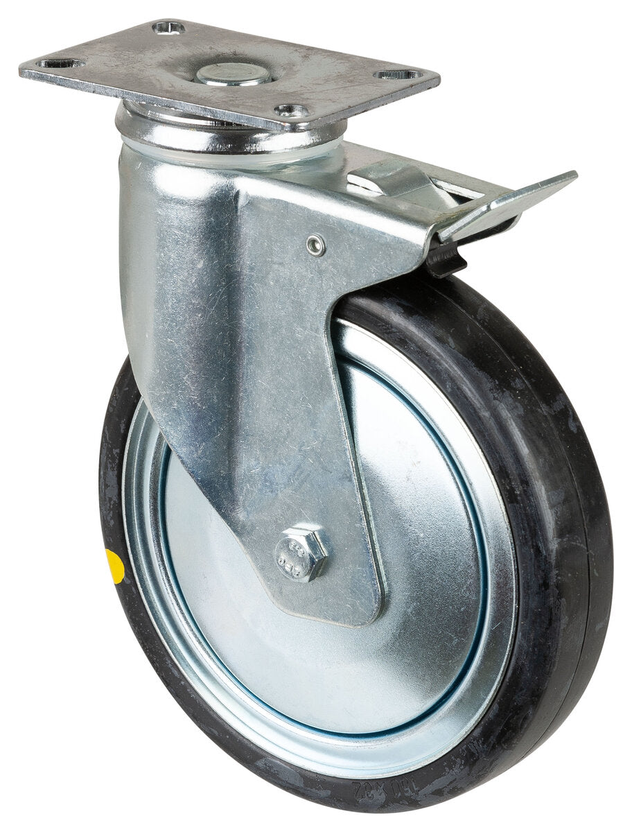 Apparathjul C120.A89.150, Produkttype: Svingbare hjul med bremser, Festing: Platefeste, Ø skruehull: 8.4 mm, Hjulets senter: Plast, Slitebane: termoplastisk gummi grå, elektrisk ledende, Lager: Kulelager, Ø hjul: 150 mm, Lastkapasitet: 100 kg