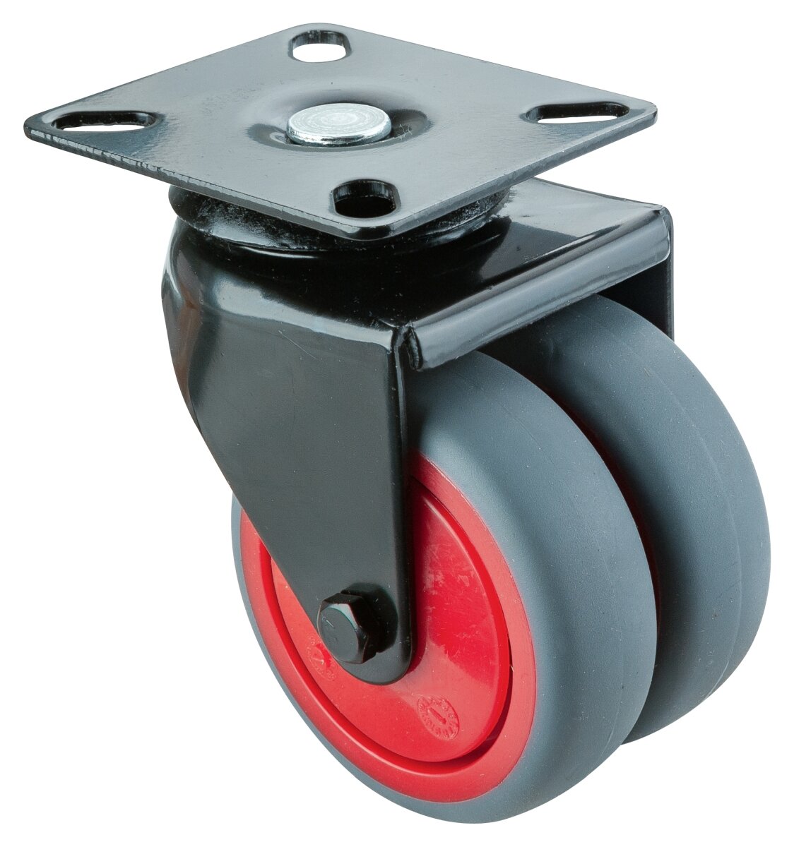 Apparathjul - dobbel B800.A85.075.03, Produkttype: Svingbare hjul, Hjulets senter: Rød plast, Slitebane: termoplastisk gummi grå, Lager: Kulelager, Ø hjul: 75 mm, Lastkapasitet: 100 kg