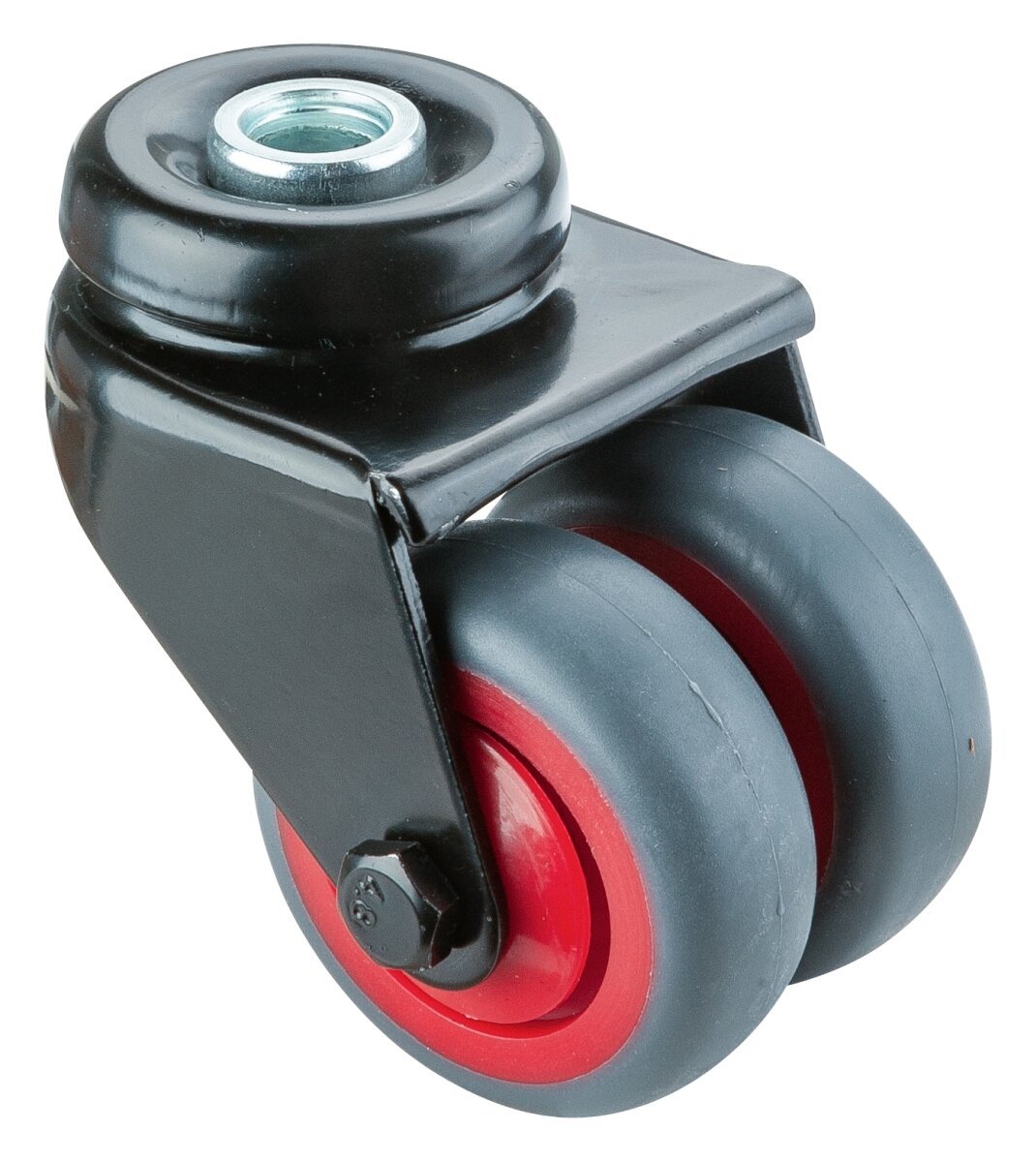 Apparathjul - dobbel B801.A85.050.03, Produkttype: Svingbare hjul, Hjulets senter: Rød plast, Slitebane: termoplastisk gummi grå, Lager: Kulelager, Ø hjul: 50 mm, Lastkapasitet: 80 kg