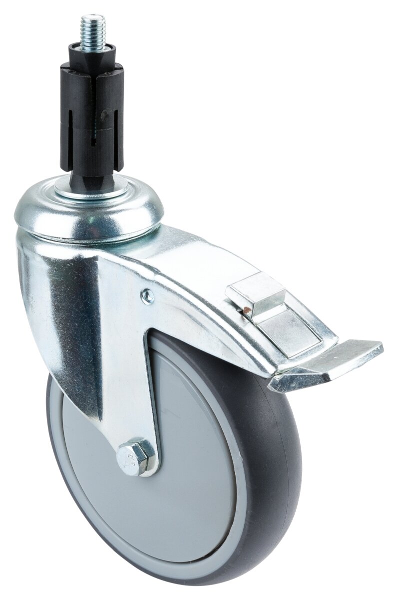 Rulle for tunge apparater C124.A85.128, Produkttype: Svingbare hjul med bremse, Hjulets senter: Plast, Slitebane: termoplastisk gummi grå, Lager: Kulelager (80, 150 mm Ø med gjengebeskyttelse i metall), Ø hjul: 125 mm, Lastkapasitet: 100 kg