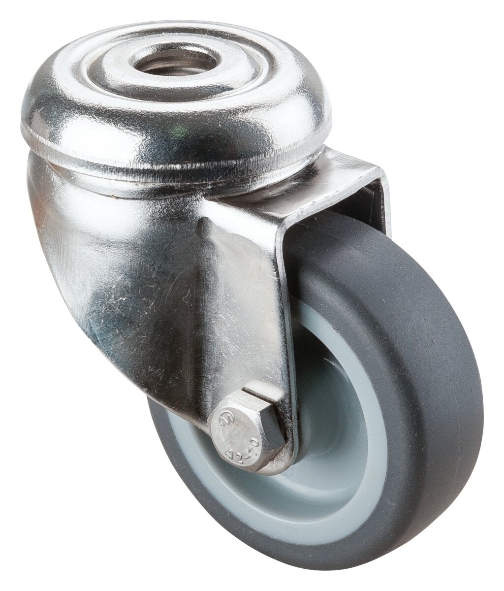 Apparathjul - Rustfri G101.A80.052, Produkttype: Svingbare hjul, Hjulets senter: Plast, Slitebane: termoplastisk gummi grå, Lager: Glidelager, Ø hjul: 50 mm, Lastkapasitet: 50 kg