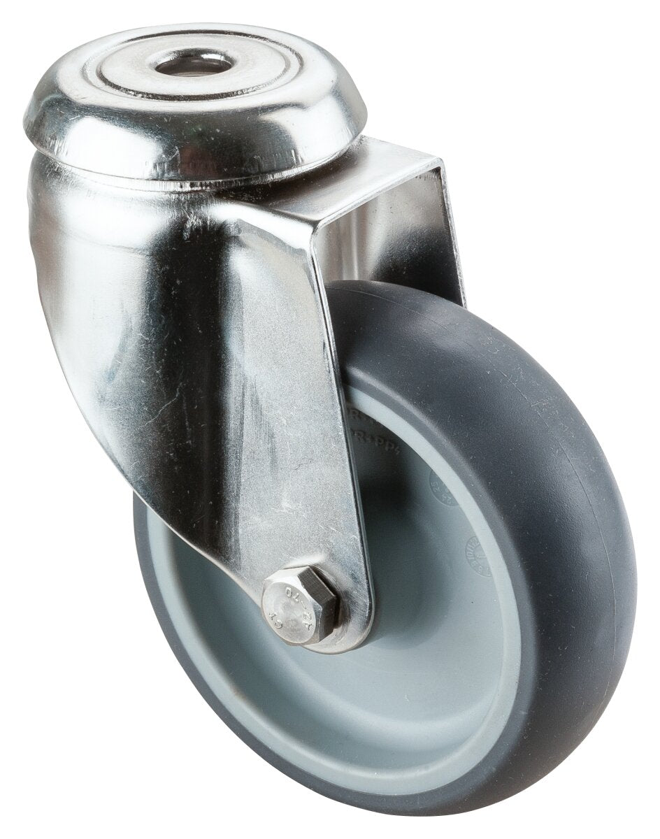 Apparathjul - Rustfri G101.A80.102, Produkttype: Svingbare hjul, Hjulets senter: Plast, Slitebane: termoplastisk gummi grå, Lager: Glidelager, Ø hjul: 100 mm, Lastkapasitet: 100 kg