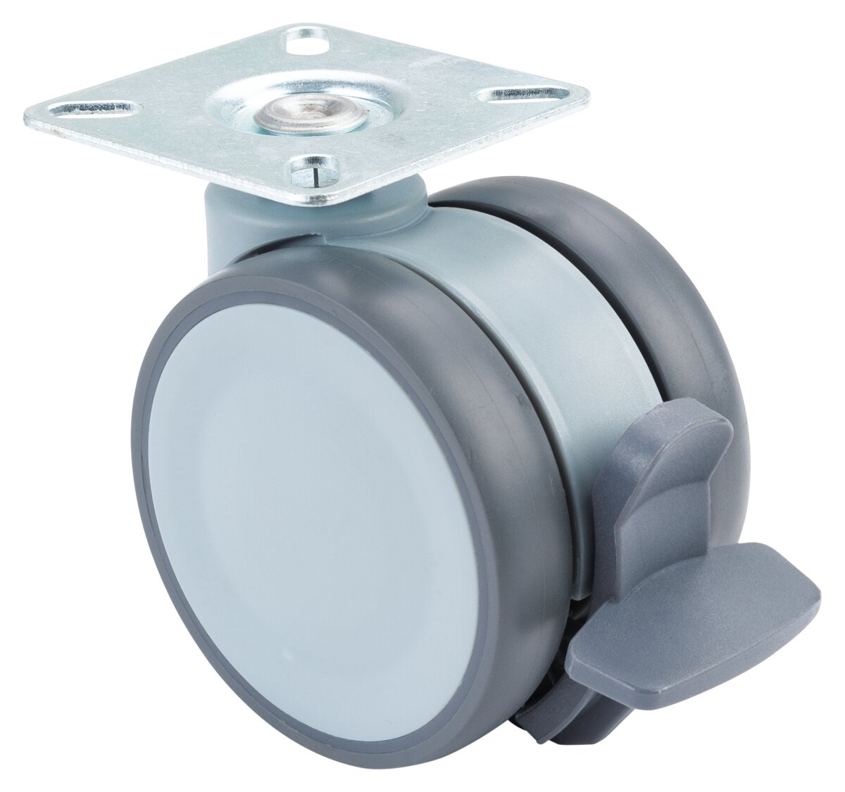 Dobbelthjul i plast med bremse F401.075, Produkttype: Svingbare hjul med bremse, Ø hjul: 75 mm, Lastkapasitet: 80 kg, Festing: Platefeste