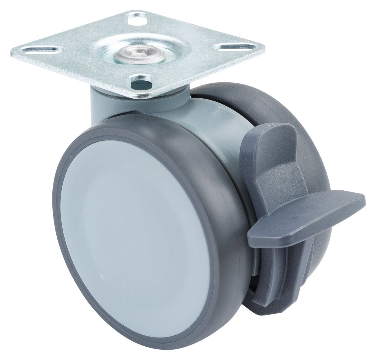 Dobbelthjul i plast med bremse F411.075, Produkttype: Svingbare hjul med bremse, Ø hjul: 75 mm, Lastkapasitet: 80 kg, Festing: Platefeste