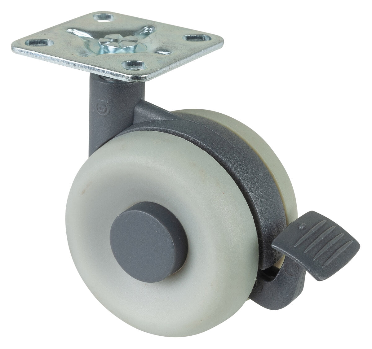 Dobbelthjul i plast med bremser F363.060, Produkttype: Svingbare hjul med bremser, Ø hjul: 60 mm, Lastkapasitet: 45 kg, Festing: Platefeste, Ø skruehull: 6 mm