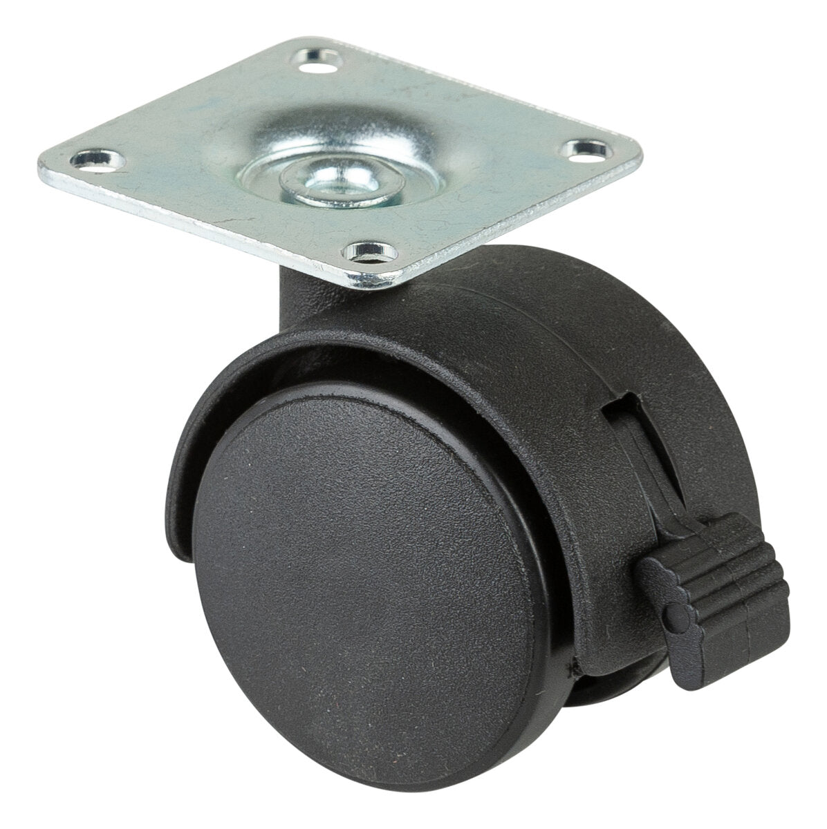 Dobbelthjul i plast med bremser F85.040.PL, Produkttype: Svingbare hjul med bremser, Ø hjul: 40 mm, Lastkapasitet: 30 kg, Festing: Platefeste, Ø skruehull: 5 mm