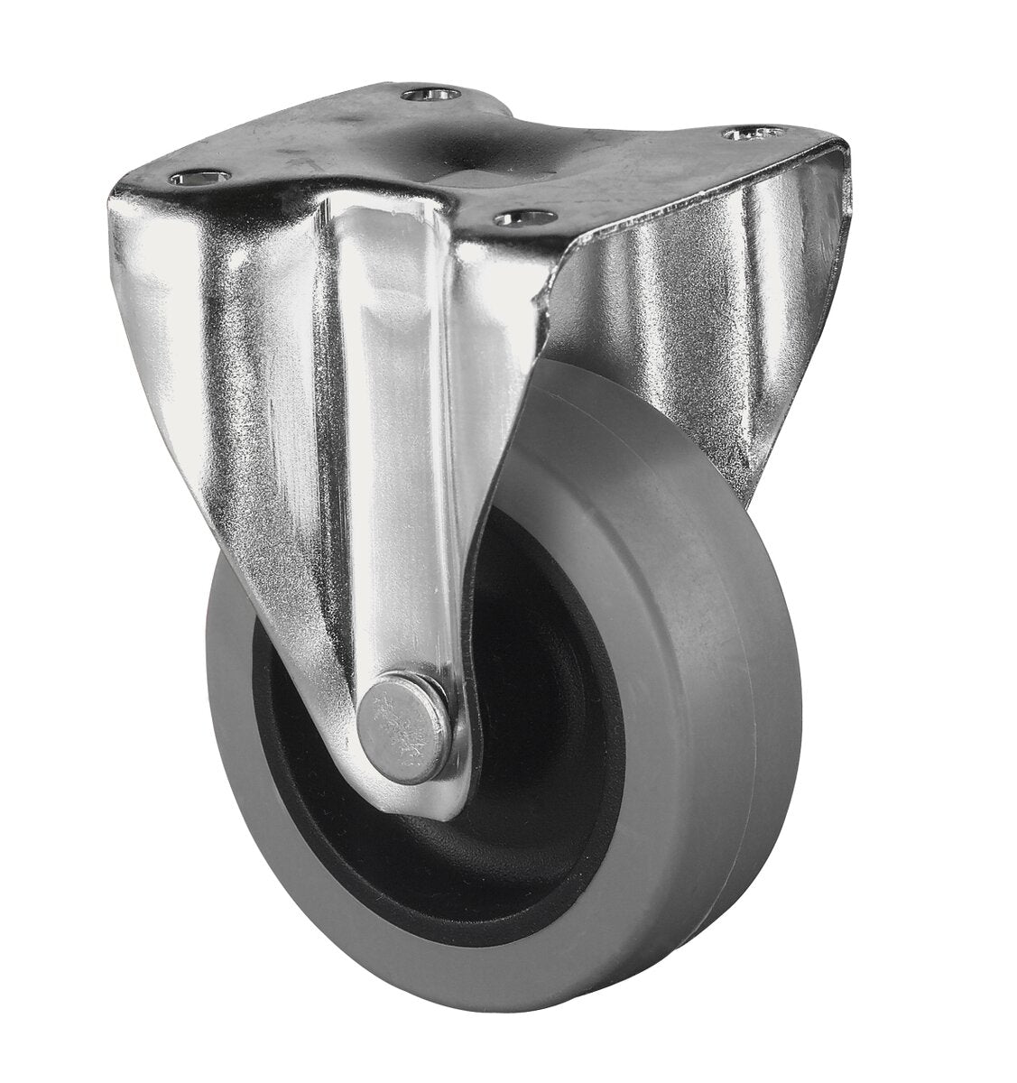 Fast hjul A210.A80.050, Produkttype: Faste hjul, Hjulets senter: Plast, Slitebane: termoplastisk gummi grå, Lager: Glidelager, Ø hjul: 50 mm, Lastkapasitet: 35 kg, Festing: Platefeste, Ø skruehull: 5.3 mm
