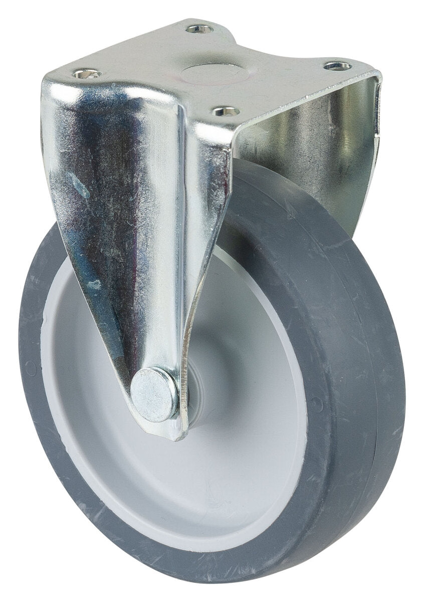 Fast hjul A210.A80.080, Produkttype: Faste hjul, Hjulets senter: Plast, Slitebane: termoplastisk gummi grå, Lager: Glidelager, Ø hjul: 80 mm, Lastkapasitet: 50 kg, Festing: Platefeste, Ø skruehull: 5.3 mm