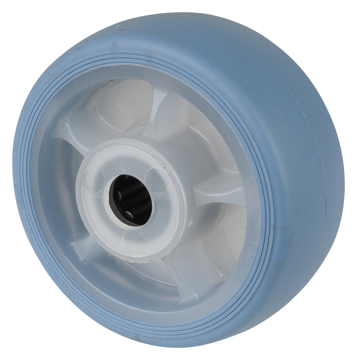 Gummihjul B44.081.F005, Produkttype: Hjul, Hjulets senter: Naturfarget plast, Slitebane: termoplastisk gummi lyseblå, Lager: Rullelager, Ø hjul: 80 mm, Lastkapasitet: 100 kg
