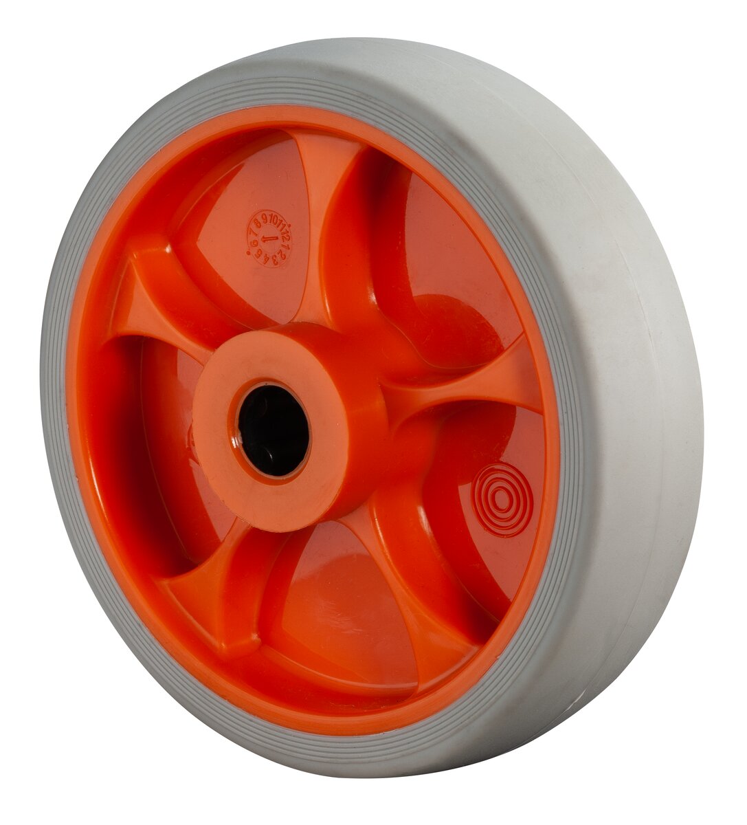 Gummihjul B44.126.F002, Produkttype: Hjul, Hjulets senter: Oransje plast, Slitebane: termoplastisk gummi lysegrå, Lager: Rullelager, Ø hjul: 125 mm, Lastkapasitet: 120 kg