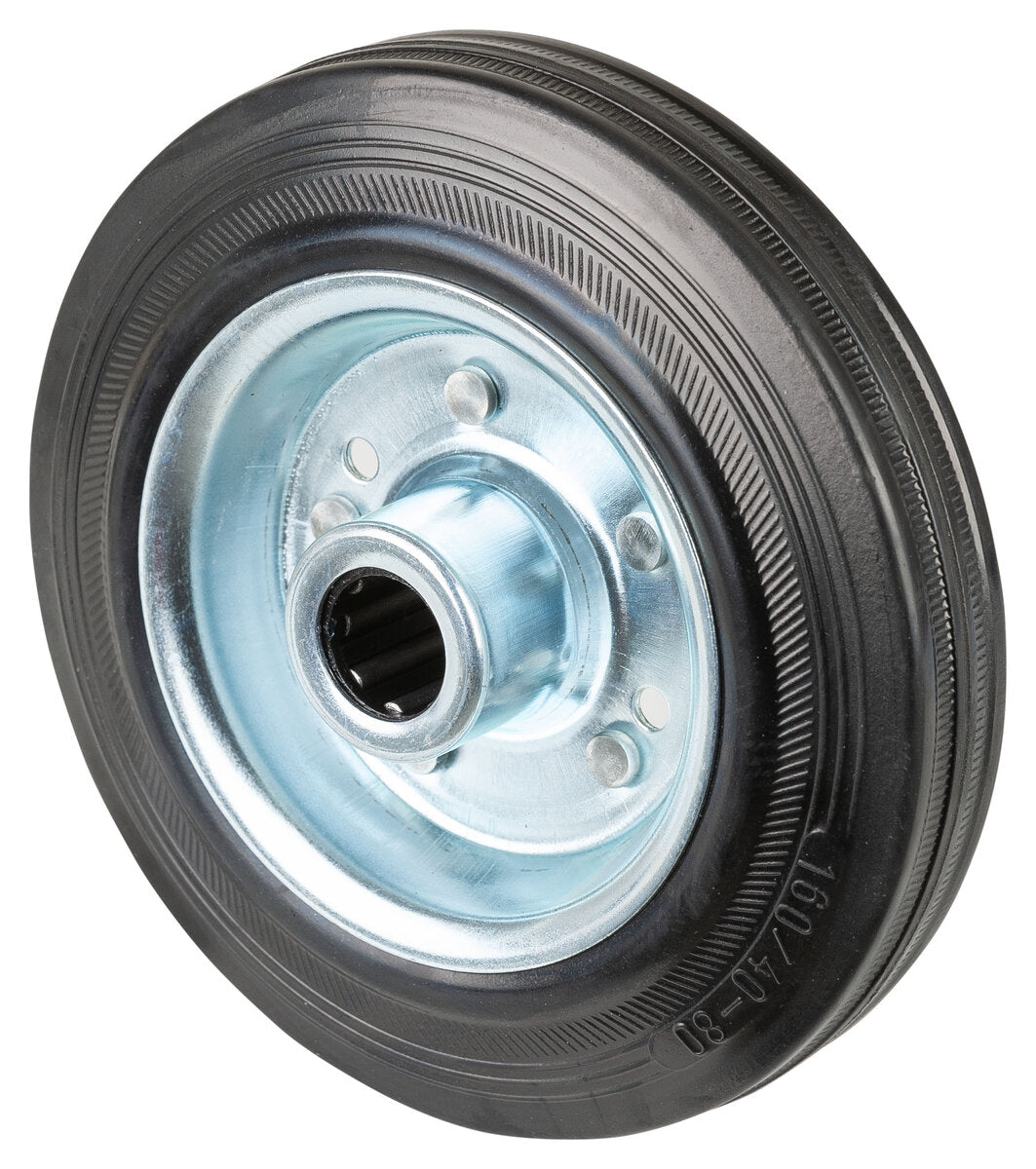 Gummihjul B55.160, Produkttype: Hjul, Hjulets senter: Felg av galvanisert stål, Slitebane: Svart gummi, Lager: Rullelager, Ø hjul: 160 mm, Lastkapasitet: 135 kg