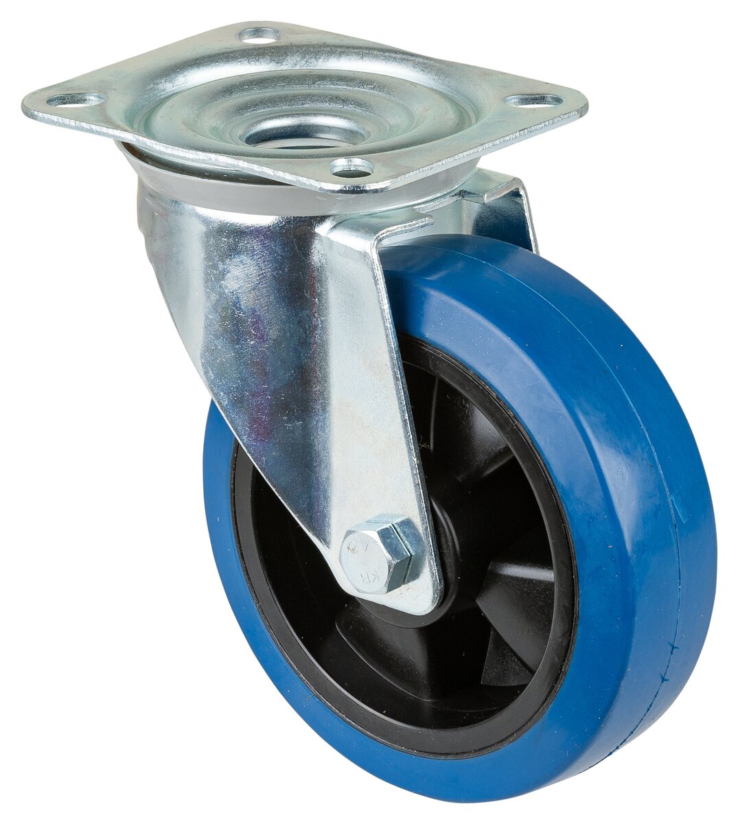 Noe som gjør det ideelt for tyngre bruksområder. Hjulbanen er laget av elastisk blå gummi, og felgen er av plast. Hjulet har kulelager for jevn og pålitelig rulling.