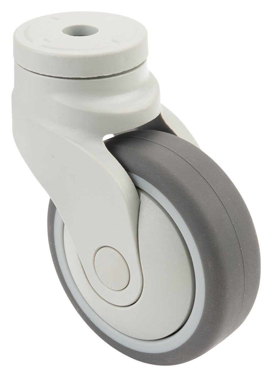 Rulle av plast C301.A82.076, Produkttype: Svingbare hjul, Hjulets senter: Plast, Slitebane: termoplastisk gummi grå, Lager: Kulelager, Ø hjul: 75 mm, Lastkapasitet: 75 kg