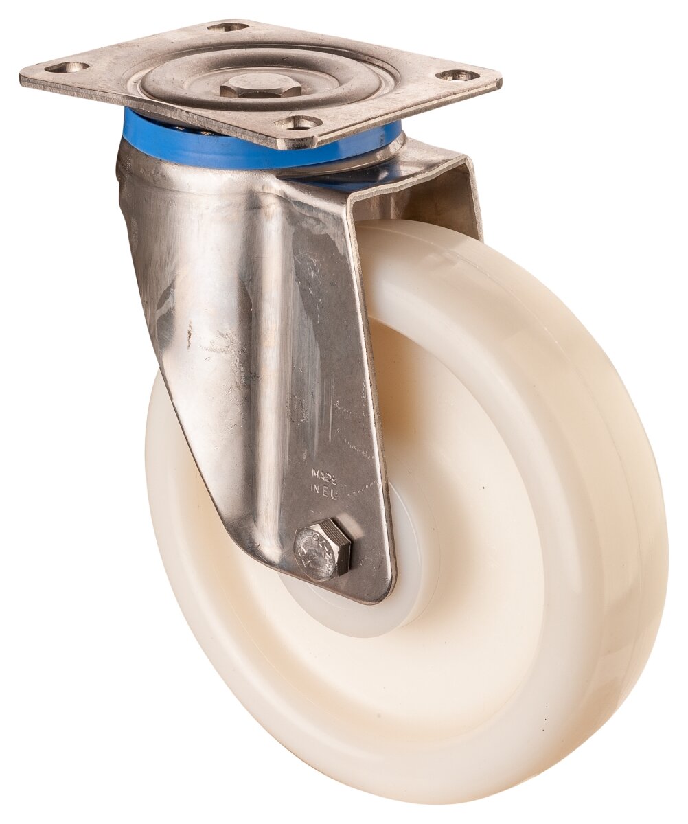 Oppdag vårt rustfrie svingbare hjul HS100.B14.202, spesialdesignet for profesjonelt bruk i lager, verksted og industri. Med en diameter på 200 mm og en imponerende lastkapasitet på 700 kg, sikrer dette hjulet både manøvrerbarhet og stabilitet under krevende forhold. Hjulets senter og slitebane er laget av holdbar polyamid, mens rullelagrene i rustfritt stål gir pålitelig ytelse og lang levetid. Velg HS100.B14.202 for effektiv kontroll og driftssikkerhet i din virksomhet.