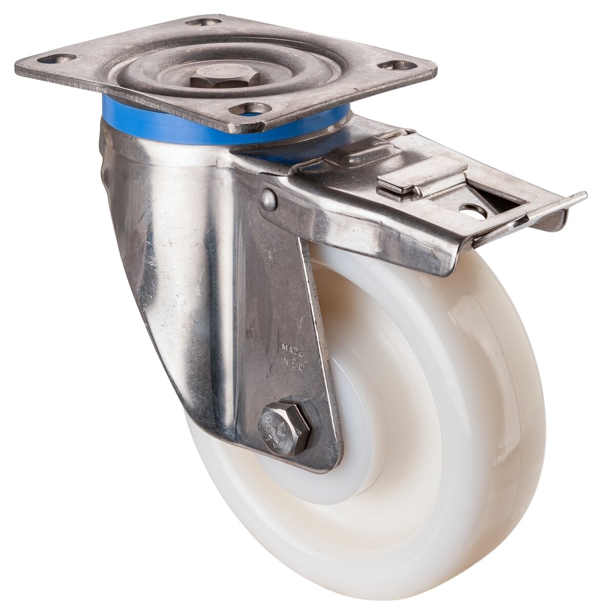 Rustfri HS120.B14.160 er et robust svinghjul med totalbrems, designet for krevende industriell bruk. Med en diameter på 160 mm og en imponerende lastekapasitet på 700 kg, gir dette hjulet enestående stabilitet og kontroll. Hjulets senter og slitebane i polyamid sikrer god manøvrerbarhet, mens de rustfrie rullelagrene garanterer langvarig pålitelighet. Ideelt for lager, verksted og industri, oppfyller dette hjulet alle krav til kvalitet og ytelse. Velg HS120.B14.160 for å heve effektiviteten på arbeidsplassen din.