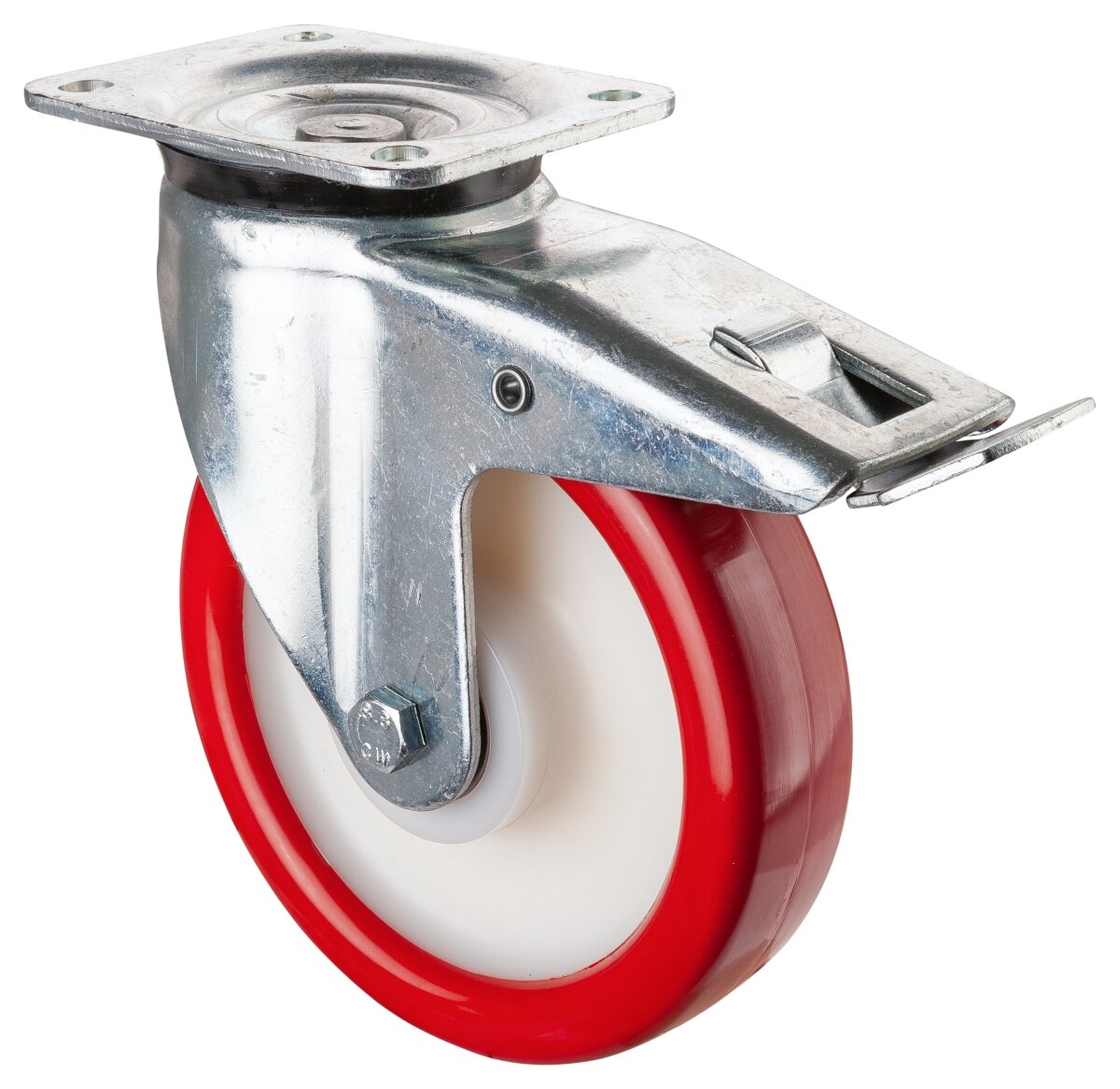 Kraftige hjul L620.B38.200, Produkttype: Svingbare hjul med totalbrems, Hjulets senter: Polyamid, Slitebane: Polyuretan rød 95+/-3 Shore A, Lager: Kulelager, Ø hjul: 200 mm, Lastkapasitet: 750 kg