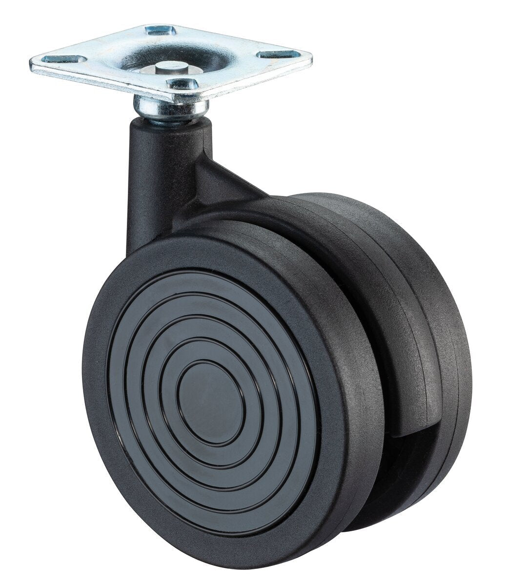 Plasthjul - dobbel F342.075, Produkttype: Svingbare hjul, Ø hjul: 75 mm, Lastkapasitet: 50 kg, Festing: Platefeste, Ø skruehull: 6 mm