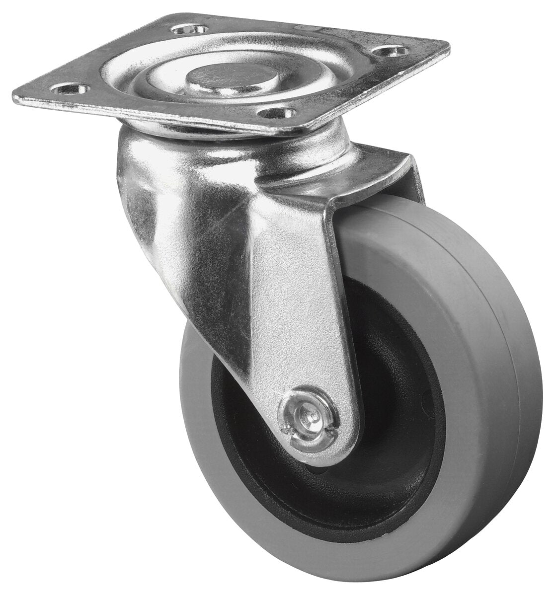 Svingbart hjul A200.A80.050, Produkttype: Svingbare hjul, Hjulets senter: Plast, Slitebane: termoplastisk gummi grå, Lager: Glidelager, Ø hjul: 50 mm, Lastkapasitet: 35 kg, Festing: Platefeste, Ø skruehull: 5.3 mm