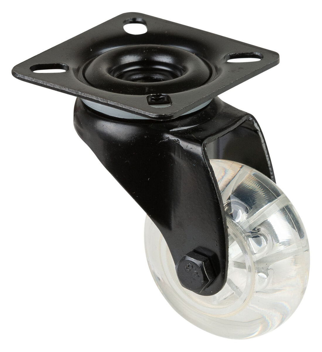 Svingbart hjul A800.A73.050, Produkttype: Svingbare hjul, Hjulets senter: Gjennomsiktig plast, Slitebane: Gjennomsiktig plast, Lager: Glidelager, Ø hjul: 50 mm, Lastkapasitet: 40 kg, Festing: Platefeste, Ø skruehull: 6.3 mm
