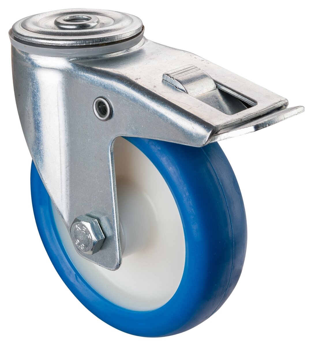 Transporthjul L121.B36.126, Produkttype: Svingbare hjul med totalbrems, Hjulets senter: Polyamid, Slitebane: Polyuretan blå 85 +/-4 Shore A, Lager: Rullelager, Ø hjul: 125 mm, Lastkapasitet: 150 kg