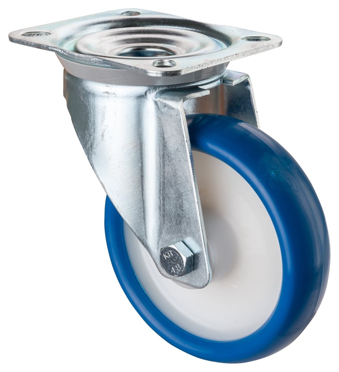 Transporthjul L400.B36.151, Produkttype: Svingbare hjul, Hjulets senter: Polyamid, Slitebane: Polyuretan blå 85 +/-4 Shore A, Lager: Rullelager, Ø hjul: 150 mm, Lastkapasitet: 200 kg
