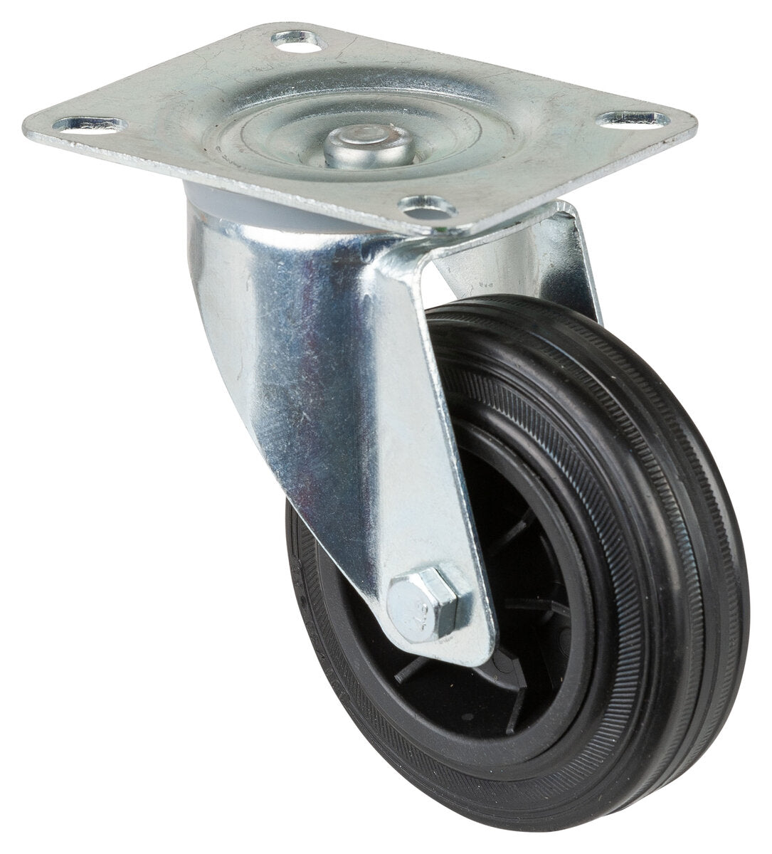 Transporthjul L400.B40.100, Produkttype: Svingbare hjul, Festing: Platefeste, Ø skruehull: 9 mm, Hjulets senter: Plast, Slitebane: Svart gummi, Lager: Glidelager, Ø hjul: 100 mm, Lastkapasitet: 70 kg