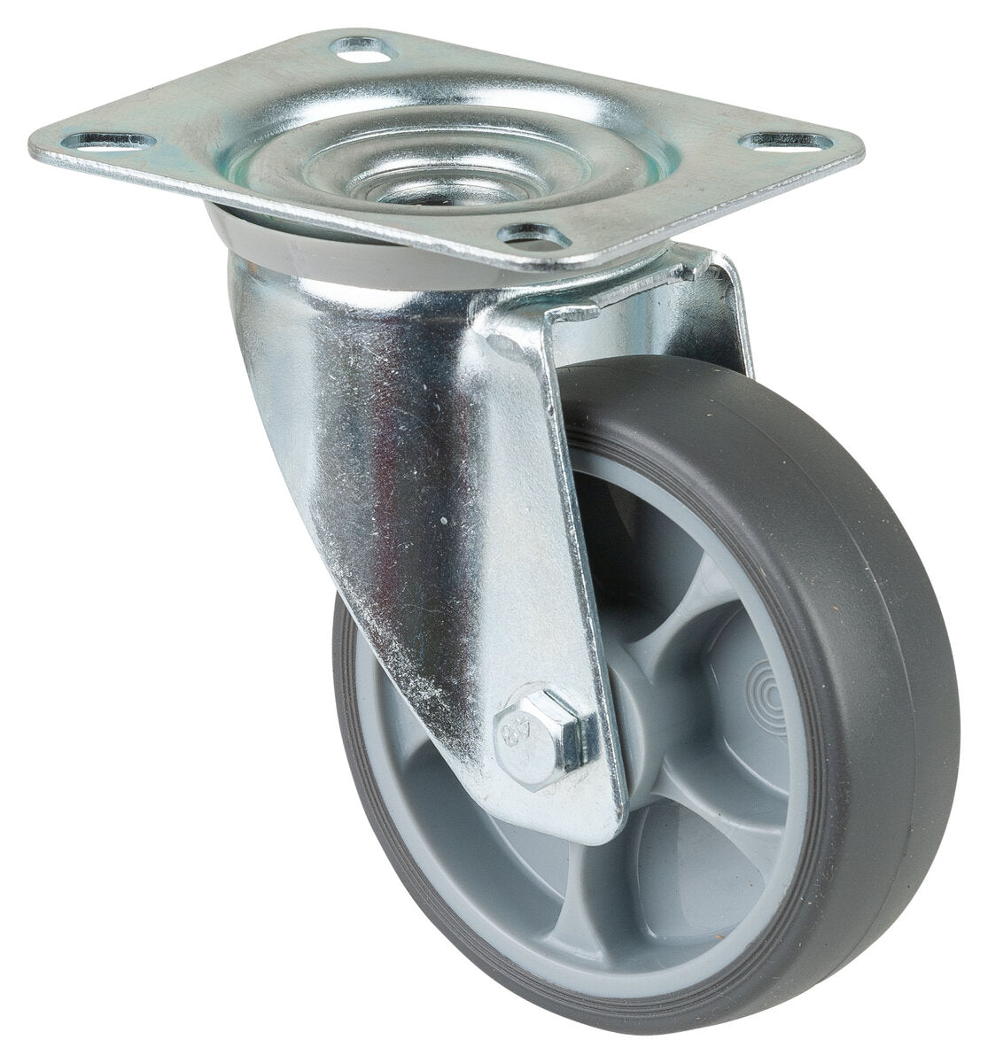 Transporthjul L400.B44.101, Produkttype: Svingbare hjul, Festing: Platefeste, Ø skruehull: 9 mm, Hjulets senter: Plast, Slitebane: termoplastisk gummi grå, Lager: Rullelager, Ø hjul: 100 mm, Lastkapasitet: 110 kg