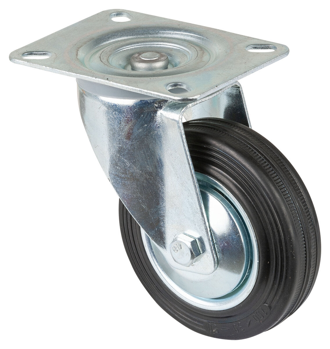 Transporthjul L400.B55.101, Produkttype: Svingbare hjul, Festing: Platefeste, Ø skruehull: 9 mm, Hjulets senter: Stålfelg, Ø 80 til 200 mm med trådbeskytter, Slitebane: Svart gummi, Lager: Rullelager, Ø hjul: 100 mm, Lastkapasitet: 70 kg