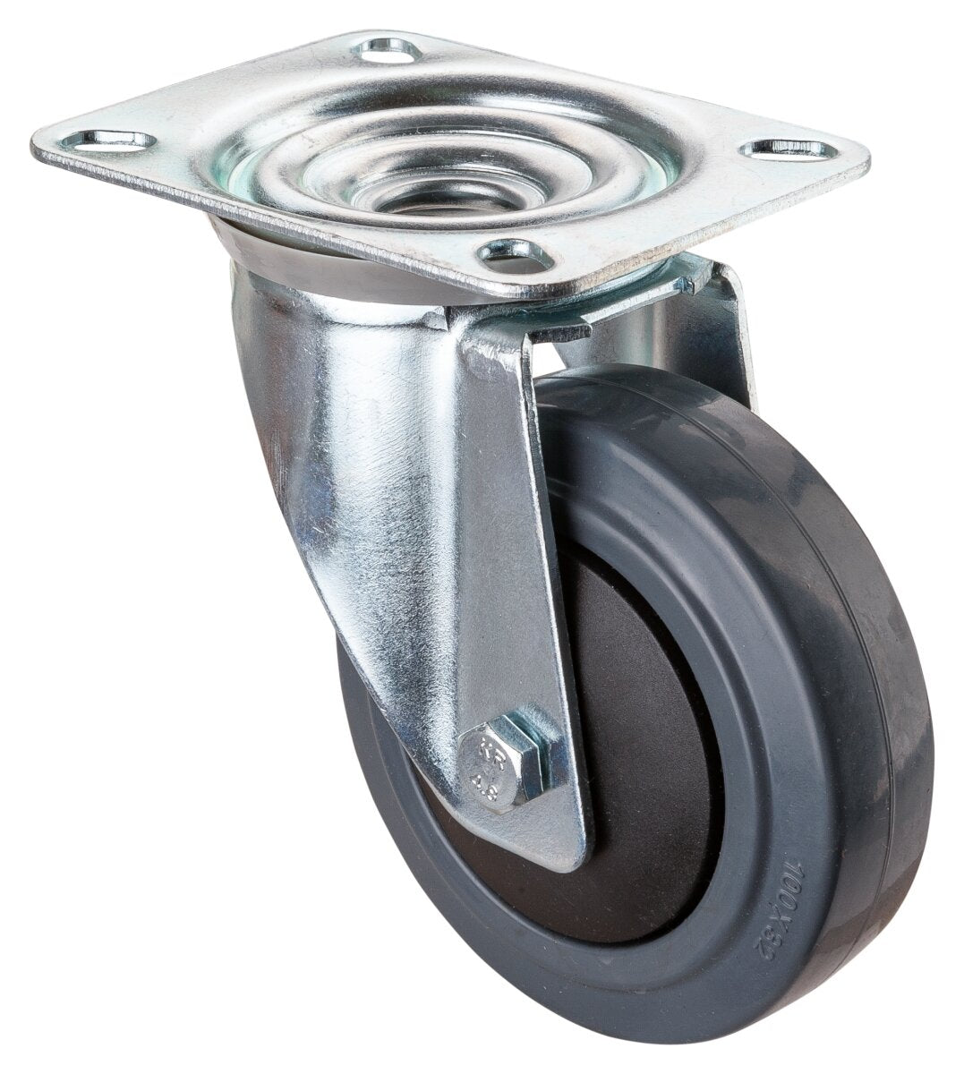 Transporthjul L400.B67.100, Produkttype: Svingbare hjul, Hjulets senter: Plast, Slitebane: Elastisk gummi grå, Lager: Kulelager, Ø hjul: 100 mm, Lastkapasitet: 150 kg