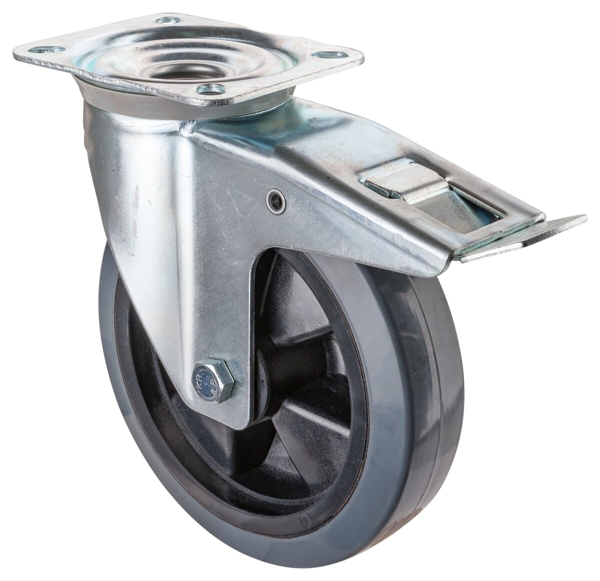 Transporthjul L400.B67.200, Produkttype: Svingbare hjul, Hjulets senter: Plast, Slitebane: Elastisk gummi grå, Lager: Kulelager, Ø hjul: 200 mm, Lastkapasitet: 300 kg