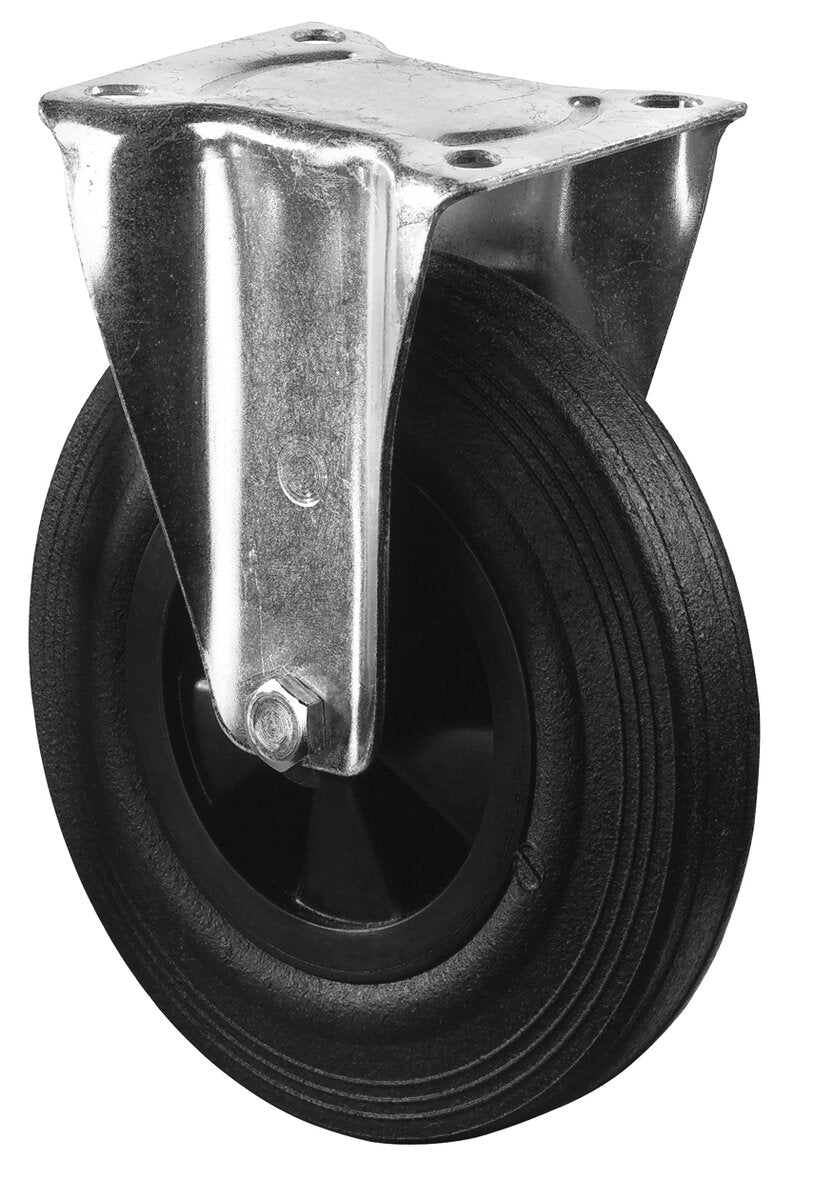 Transporthjul L410.B40.125, Produkttype: Faste hjul, Festing: Platefeste, Ø skruehull: 9 mm, Hjulets senter: Plast, Slitebane: Svart gummi, Lager: Glidelager, Ø hjul: 125 mm, Lastkapasitet: 100 kg