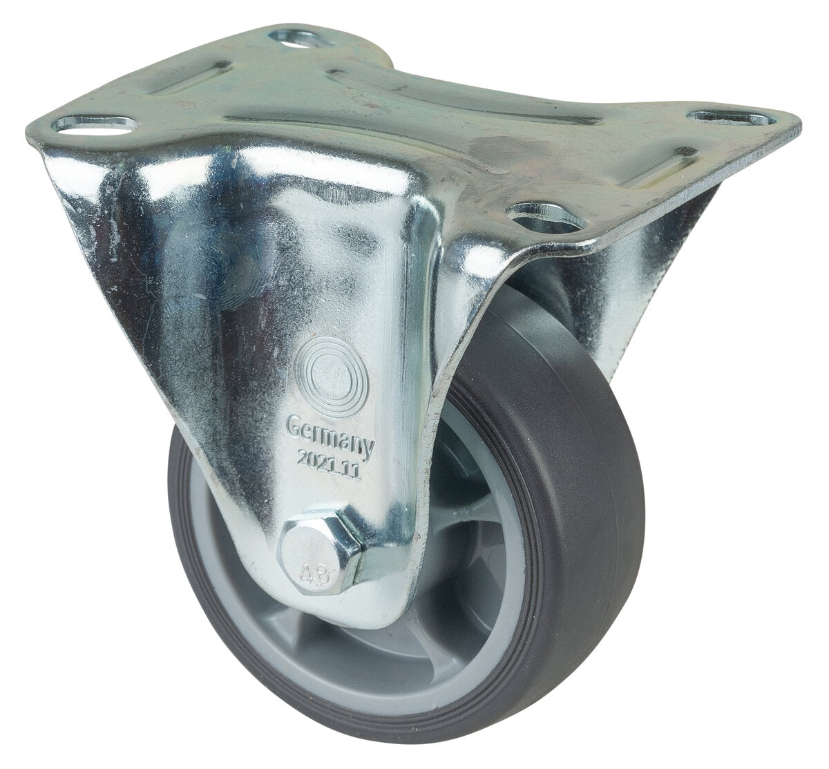 Transporthjul L410.B44.081, Produkttype: Faste hjul, Festing: Platefeste, Ø skruehull: 9 mm, Hjulets senter: Plast, Slitebane: termoplastisk gummi grå, Lager: Rullelager, Ø hjul: 80 mm, Lastkapasitet: 100 kg