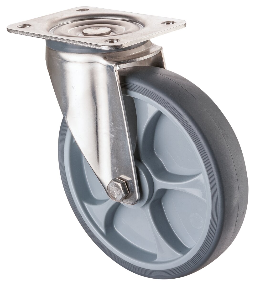 Transporthjul - Rustfri H100.B43.201, Produkttype: Svingbare hjul, Hjulets senter: Plast, Slitebane: termoplastisk gummi grå, Lager: Glidelager, Ø hjul: 200 mm, Lastkapasitet: 220 kg