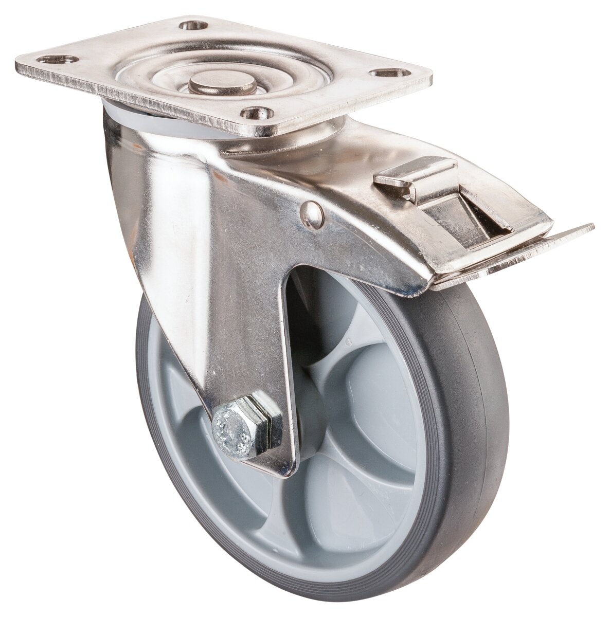 Transporthjul - Rustfri H120.B43.127, Produkttype: Svingbare hjul med bremser, Hjulets senter: Plast, Slitebane: termoplastisk gummi grå, Lager: Glidelager, Ø hjul: 125 mm, Lastkapasitet: 120 kg