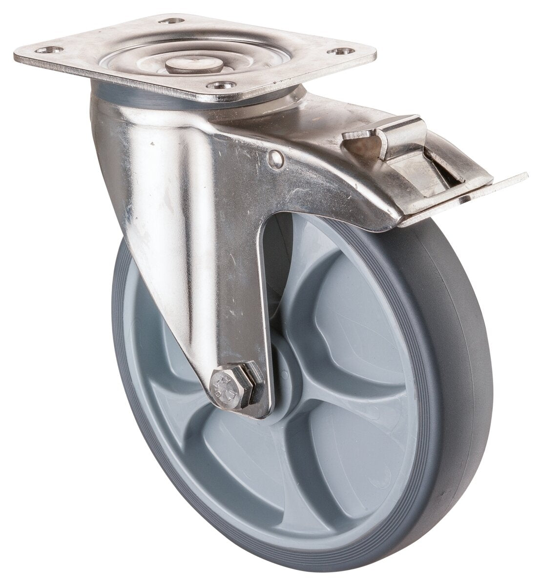 Transporthjul - Rustfri H120.B43.201, Produkttype: Svingbare hjul med bremser, Hjulets senter: Plast, Slitebane: termoplastisk gummi grå, Lager: Glidelager, Ø hjul: 200 mm, Lastkapasitet: 220 kg